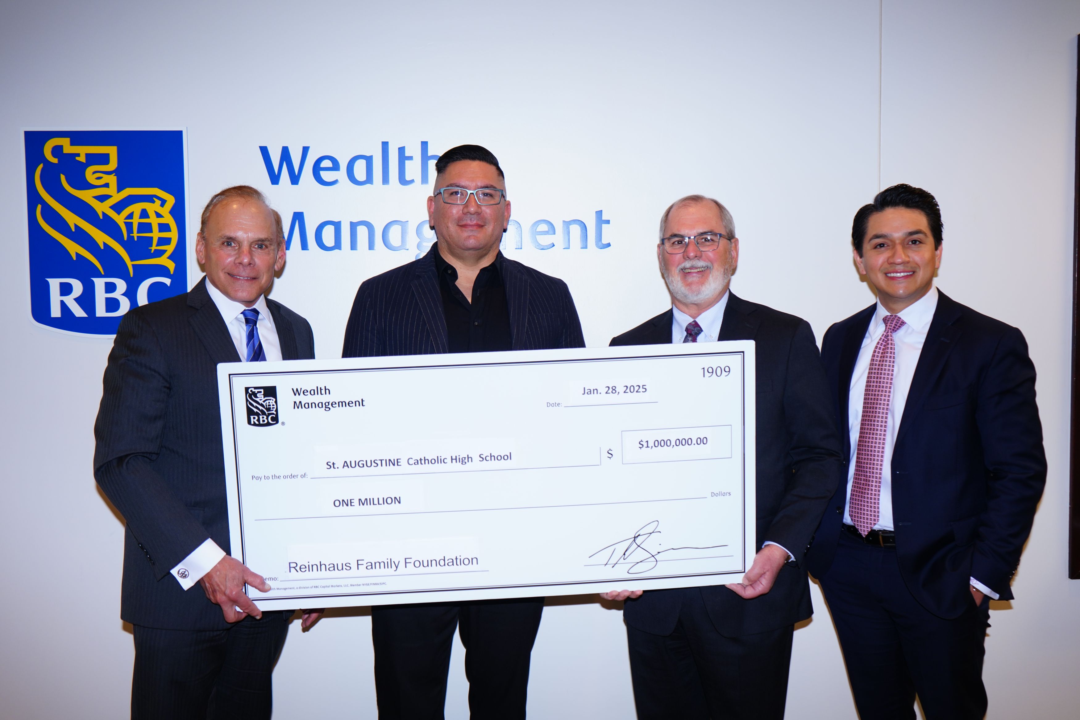 St. Augustine Catholic High School was honored to receive a $1,000,000 endowment from the Reinhaus Family Foundation. The proceeds from the investments from the fund will be used to support student scholarships. The school is very grateful for the support of its benefactors, especially Tim Dunne and Hector Corrales of the Reinhaus Family Foundation.