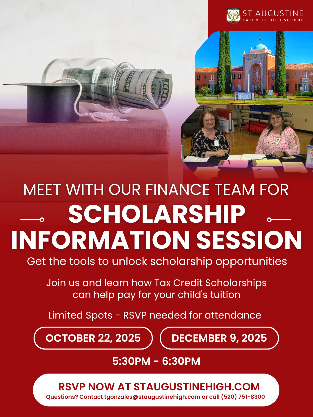 Join our Finance Team to learn how Tax Credit Scholarships can make a St. Augustine education affordable for your family. These sessions will walk you through how Arizona’s tax credit system works and how scholarships can help cover your child’s full tuition at St. Augustine Catholic High School.